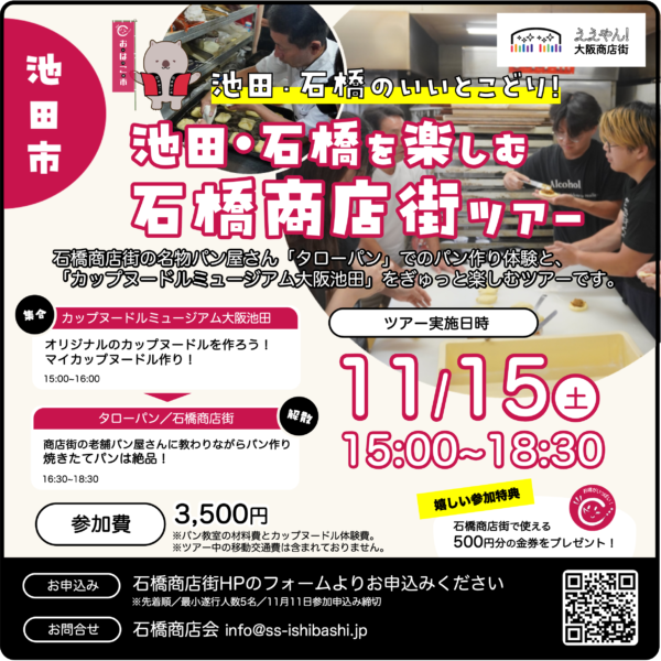 今回は、石橋商店街の名物パン屋さん「タローパン」でのパン作り体験と、「カップヌードルミュージアム大阪池田」でのマイカップヌードル作りです。
