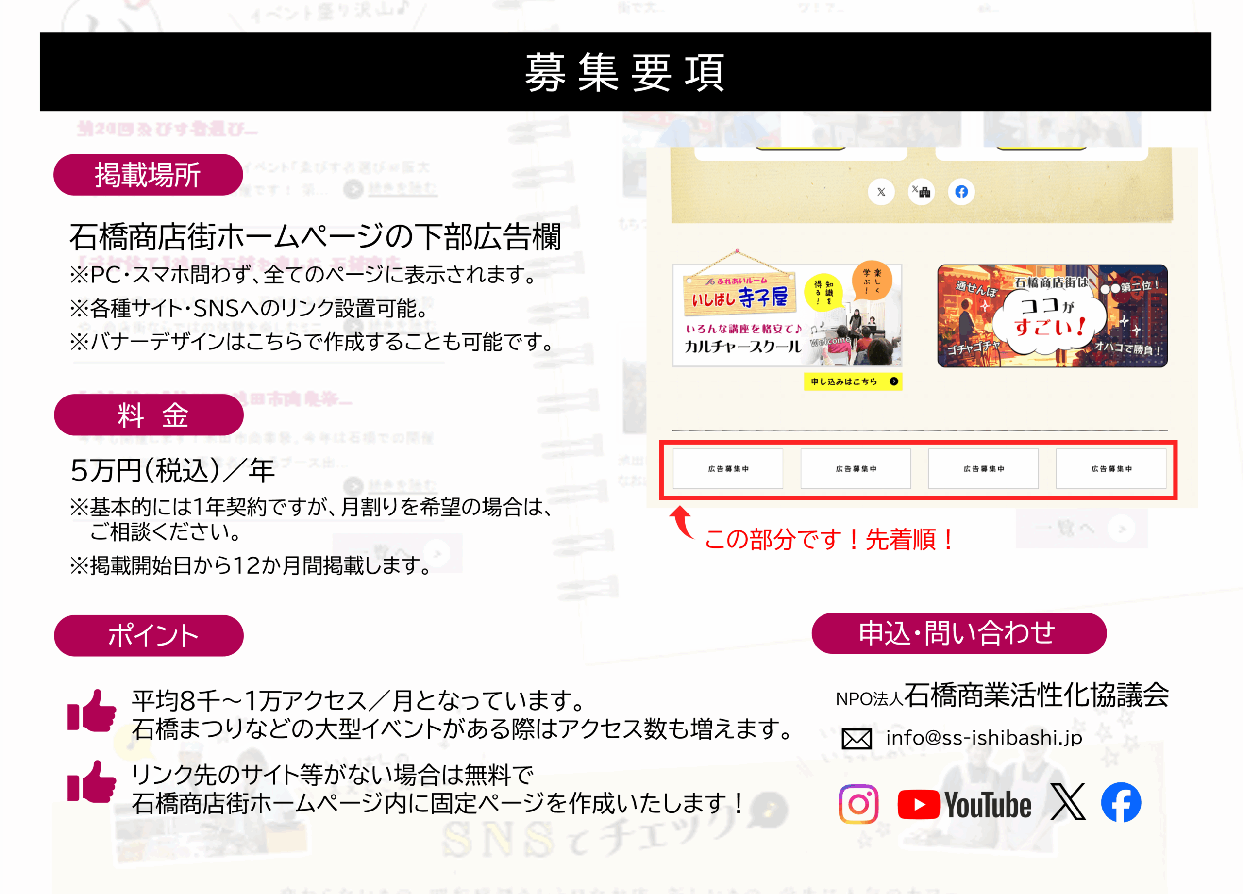 石橋商店街ホームページにバナー広告をご出稿いただける会社・団体の皆さまを募集しています!
